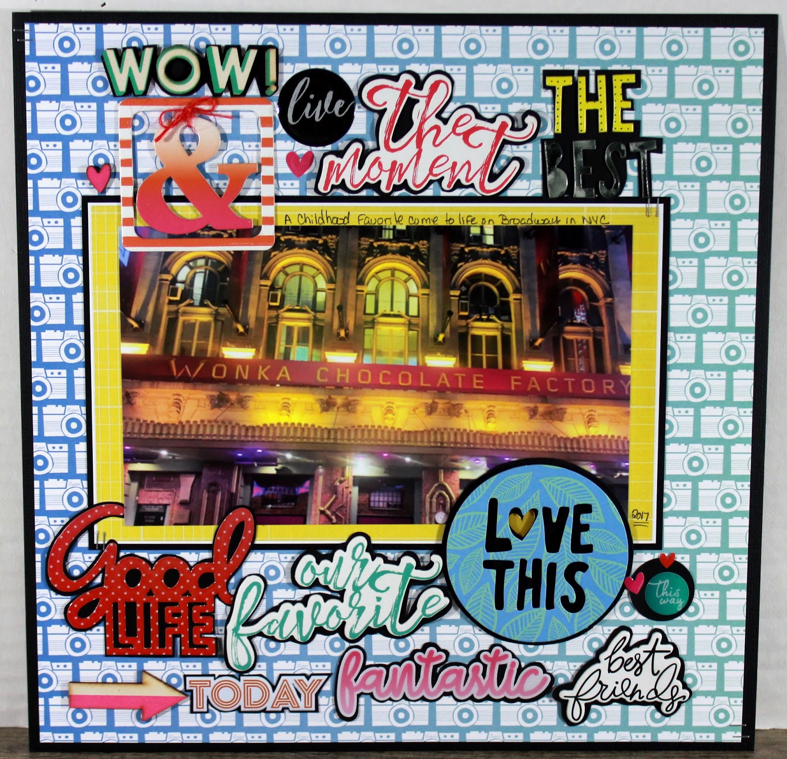 On the creative front, here's 4 more pages to share. I used my July 2017 Hip Kit for all of the pages that I'm sharing today. Willy Wonka & the Chocolate Factory is on Broadway now and my daughter sent me this photo. We haven't gone to see it yet but we will. It was a favorite show of mine when I was growing up and a favorite show of my kids when they were growing up......